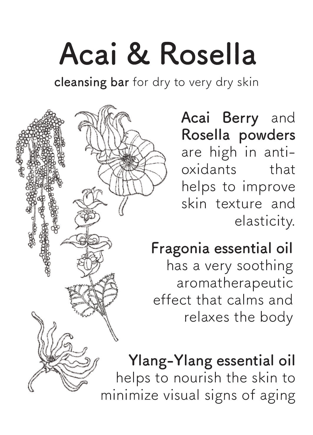 Made with Alkanet, Fragonia and Ylang-Ylang, Acai & Rosella cleansing bar cleanses the skin with a deeply sweet and soothing scent. Free of soap, this cleansing bar uses a plant-based surfactant derived from Coconut Oil, that is gentle and safe. With a pH close to the human skin, Acai & Rosella cleansing bar can be used by all skin types, but is more suitable towards dry or mature skin.