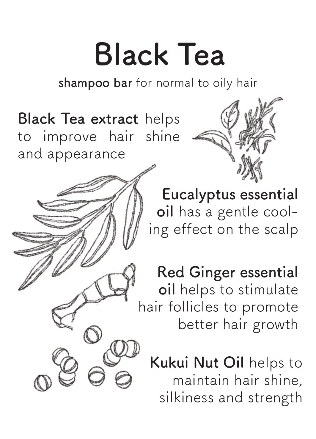 Made with Eucalyptus, Red Ginger and Kukui Nut Oil, Black Tea shampoo bar cleanses the scalp and hair with a cool fresh mint scent. Free of soap, this shampoo bar uses a plant-based surfactant derived from Coconut Oil, that is gentle and safe. With a pH suitable to keep the hair and scalp healthy, Black Tea shampoo bar is suitable for supporting hair growth on normal to oily hair