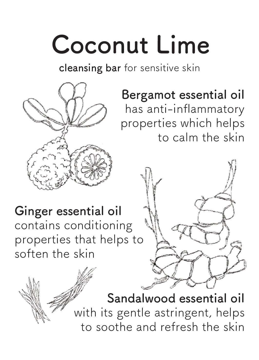 Made with Bergamot, Ginger and Sandalwood, Coconut Lime bar cleanses the skin with a fresh and warm citrus scent. Free of soap, this cleansing bar uses a plant-based surfactant derived from Coconut Oil, that is gentle and safe. Coconut Lime cleansing bar can be used for all skin types but is more suitable for sensitive skin types.